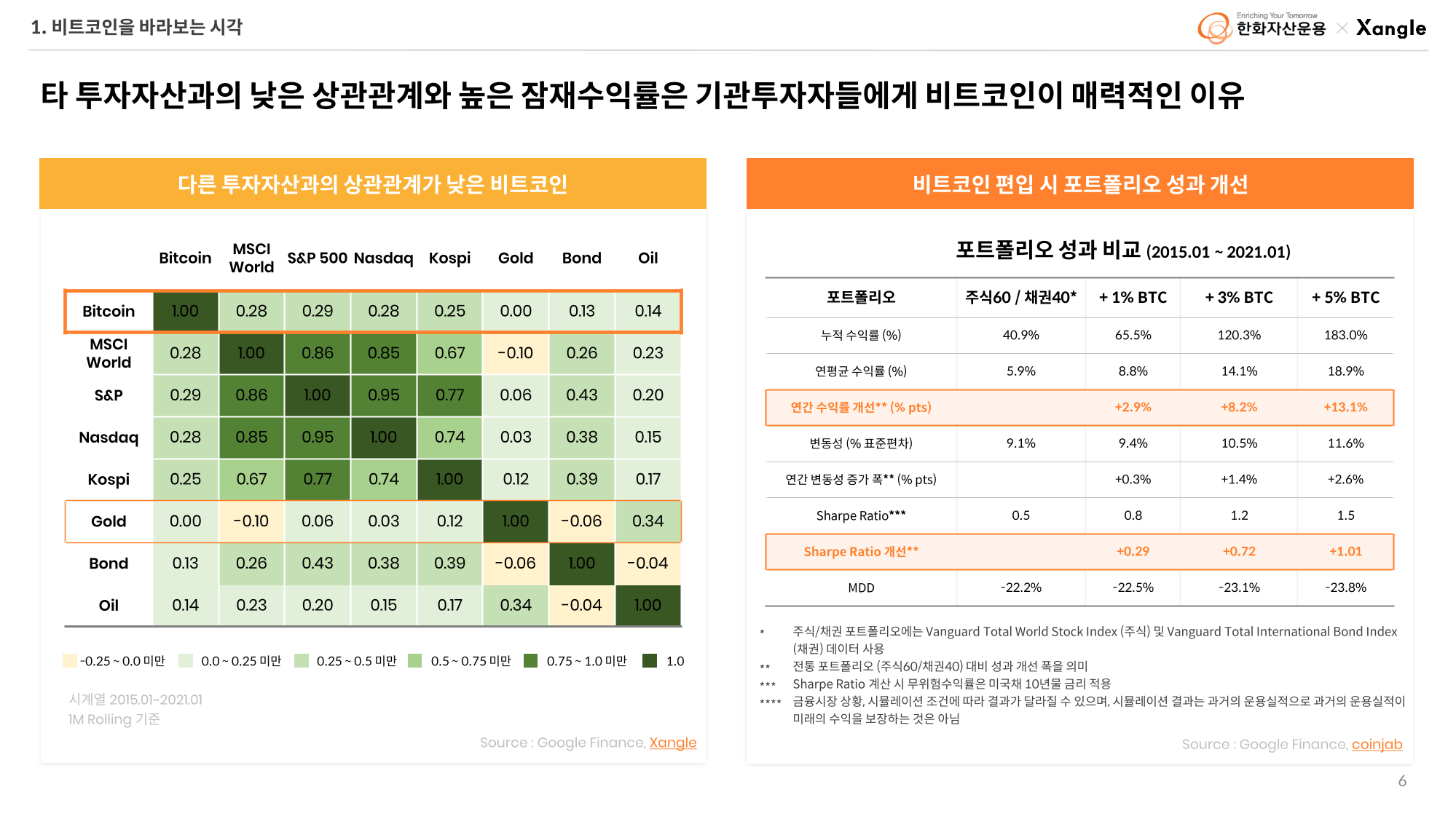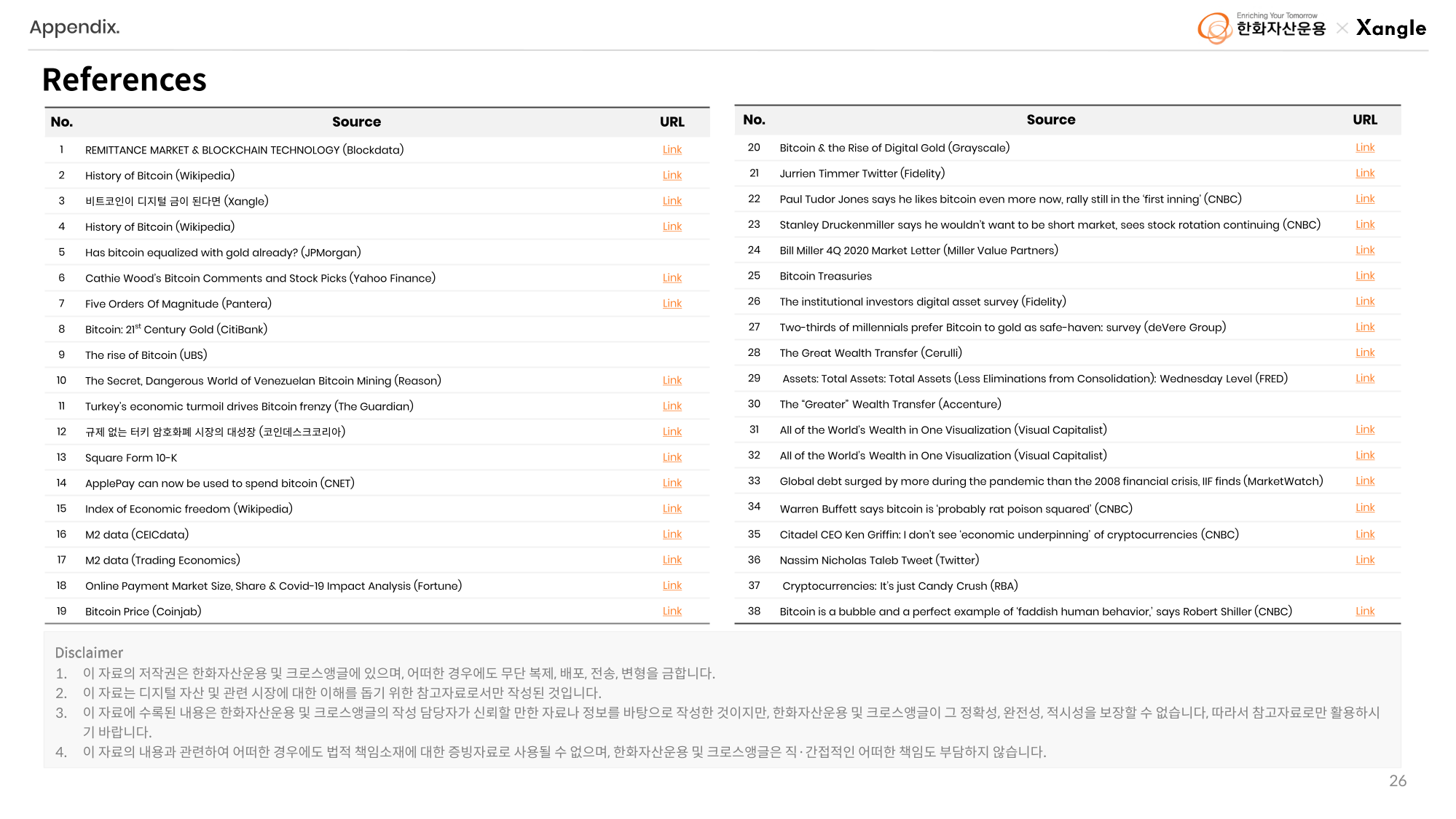 한화자산운용과 크로스앵글은 디지털 자산시장에 대한 심도있는 리서치를 통해 투기문화를 근절하고 객관적이고 신뢰할 만한 정보를 제공할 계획입니다. 양사가 협력하여 매달 디지털 자산 시장에 대한 보고서를 발간하고 관련 웨비나를 정기적으로 진행할 예정입니다. 많은 관심과 성원 부탁드립니다.