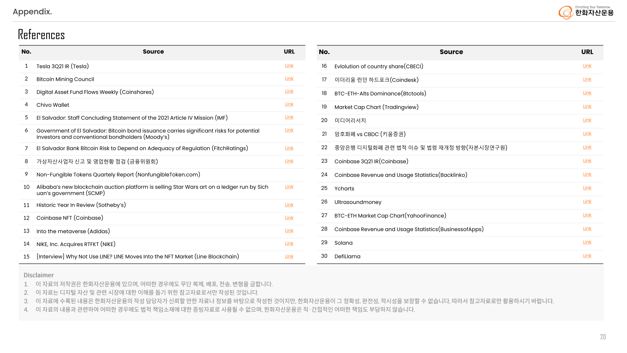 한화자산운용과 크로스앵글은 디지털 자산시장에 대한 심도있는 리서치를 통해 투기문화를 근절하고 객관적이고 신뢰할 만한 정보를 제공할 계획입니다. 양사가 협력하여 매달 디지털 자산 시장에 대한 보고서를 발간하고 관련 웨비나를 정기적으로 진행할 예정입니다. 많은 관심과 성원 부탁드립니다.